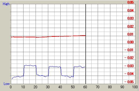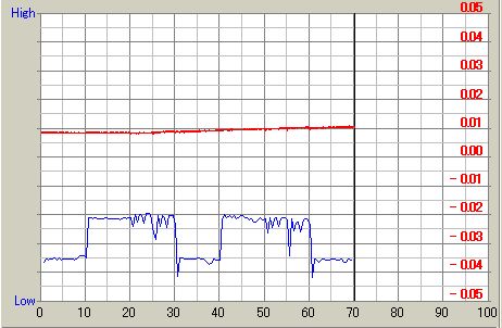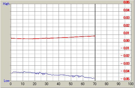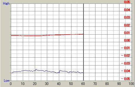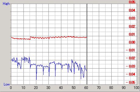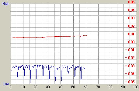結果 Beta値のギザギザはないですが、Jitter値のギザギザは相変わらずです。特に周期的な深い溝が気になります。トラックの境目ぐらいにあるような気がします。 これは、イメージから焼いたものですが、直接焼いても、12回分計60分のWAVEを作成して焼いても、同様の結果でした。