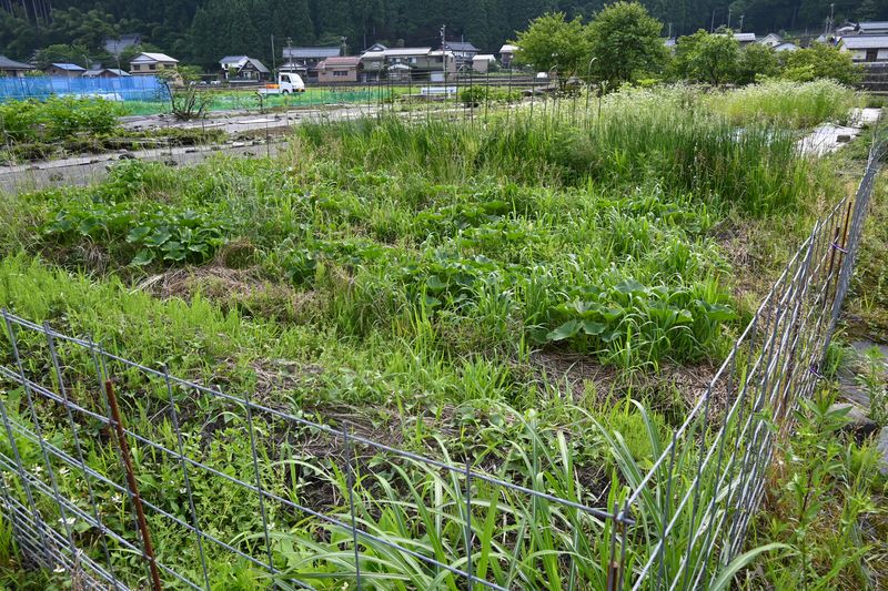 集落の畑団地の一角。3箇所約260平方メートルの耕作放棄地があったが、そのうちの約200平方メートルを防草シートを剥がして畑に戻した。ジャガイモやかぼちゃなど、手入れが少なくて済む野菜をメインに育てている。