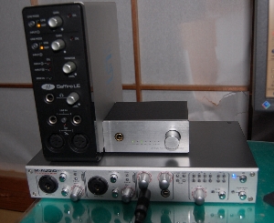 普段のPCではRATOC RAL-24192UT1をUSB-DACヘッドフォンアンプとして使っています。やはり手元にボリュームがあるほうがヘッドフォンは使いやすいですからね。FireWireになかなか手を出せずにいたのですが、ヤフオクで安価に見かけたのを買ってみました。Focusrite の Saffire LE です。