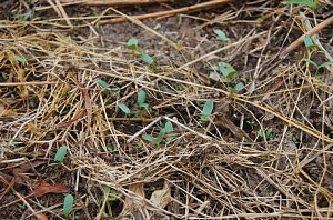 10月25日蒔きのえんどうの芽が出てきました。周囲はライ麦です。いんげんとの交互作を試しています。うまく年越しできますように。