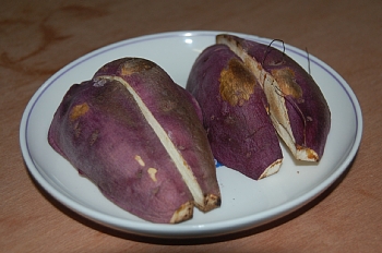 蒸したり、焼いたり、おやつに食べるのが多いですね。あまり甘くないですが、さっぱりさわやかです。来年からさつまいも専用畝にしていくつもりで、今はクリムゾンクローバーなどの緑肥の芽が出ています。