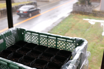温室があれば申し分ないがそんなものはない。そこで密かに?目論んでいるのが、車庫の2階だ。南向きの広い窓があって、陽当たりがいい。台を置き、レタスの種を蒔いたポットを窓際に設置した(窓際のポットちゃん? 笑)。2階だから暖かいだろうと暖房はしない、というかできない (^^:: 問題は水やりで、物置にはなっているがいちおう普通の座敷なので、水をこぼせない。野菜収穫用のかごにトンネル用ビニルシートを被せて防護壁にしてあるのはそのためだ。さて、どうなるかな?
