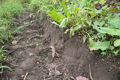 自然栽培に向いている土質の問題もありそうだ。ようやくわかってきたが、家の前の畑はえらく粘土質で水位が高い。それに、裏山の崖崩れ防止工事の際、重機が何か月も敷いた鉄板の上を行き来している。2年でまあまあになった畑団地とはえらい違いだ。しかし、深い団粒構造ができている場所もないではない。それを参考に、高畝を少し作ってみた。やはり酸素の供給が大事なのではないだろうか。
