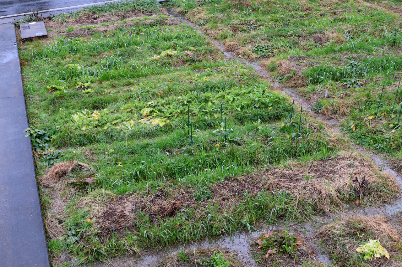 春に咲いた花のこぼれ種から育ったからし菜(筆者は蒔いていません)と、玉ねぎです。玉ねぎを植えた10月15日には何もなかったですから、秋の葉物のお手本?になるような順調な生育ぶりです。皆がこんなだったらいいのに(笑)。