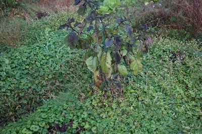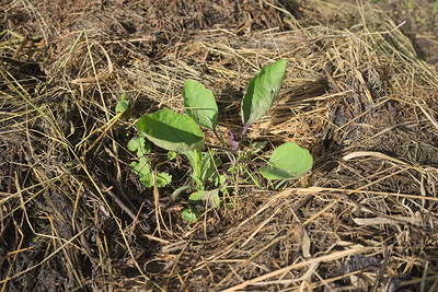 収穫も終わり、野草に覆われた畝。この畝、以前はハコベが茂っていたが、ここ2年ほどのうちに変わった。何だろう? ホトケノザに葉っぱが似ているようだが、そうでは無いし。