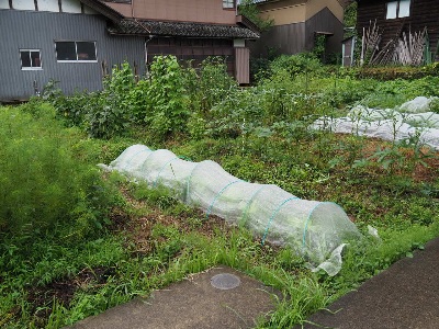 畑団地のほうでも1畝育てているが、周囲が防草シートばかりなこともあって、虫が少なく、こちらにはネットを使わなかった。