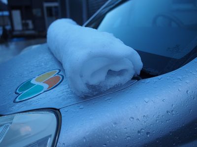 向こう隣の車のボンネットにあった。フロントガラスの雪がまるまったらしい。
