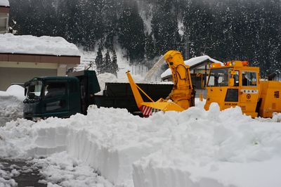 ロータリー除雪車とダンプカーが来た。ま近で見るのが妻は初めてらしく、大はしゃぎだった。