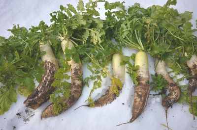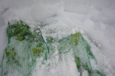 大根の保存方法にもいろいろあり、まとめて収穫してから土に埋めてもよかったが、雪に埋もれれば暖かく護ってくれるそのまんま放置がぐうたらな筆者にはあっている。網は猿害防御のために設置していた。