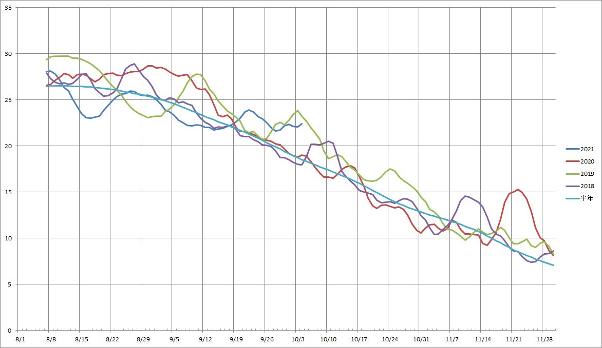 10月に入ってすぐ、ここにツケナ類を蒔く予定なのだが、今年の9月後半はちと気温が高い。ネットなしで種を蒔くのは過去7日間の平均気温が19℃を下回る頃と決めているのだが、さて、来週蒔けるかな?
