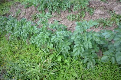 秋じゃが生育中。先に肥料も使うと言ったが、無肥料もお試し中。