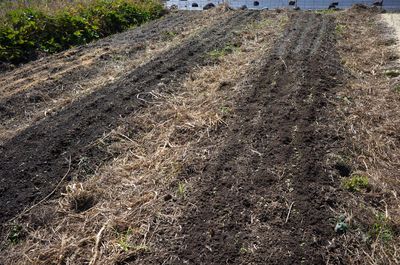 玉ねぎをずっと育てていた畝の土がいい感じだったので、今年はここにも種蒔きした。しかし、ここだけ発芽率が良くない。種蒔きはいつもの通り、筋蒔きして、足で踏みつけるだけ。土はかけない。好光性のツケナ類はこれで十分なはずだ。玉ねぎの雑草防止にずっと籾殻を使ってきたのだが、通気性が良すぎて保水性がないのだろうか?