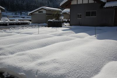 木枠と緑のネットで囲ってあるのは昨秋からのブロッコリー。妻は登呂遺跡と呼んでいる。雪にしっかり備えておいて良かった。