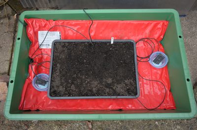 それが今年は何の心配もない。加温マット以外の機器類は温室とは別の大きいケースに入っているのだ(画像では、雪囲いの波板の内側にある)。コンセントもすべてここに集結。屋内用サーモスタットでも大丈夫。温度ロガーも入れている。唯一、加温マットが問題になるかもしれないが、元々屋外用だし、一昨年は水浸しでも大丈夫だったから、さほど心配はしていない。いざとなったら屋外ブレーカーもあるし。