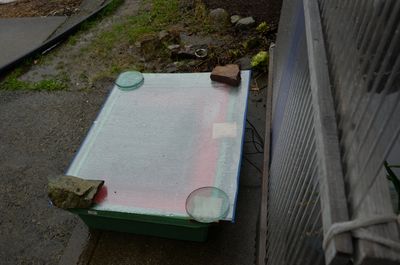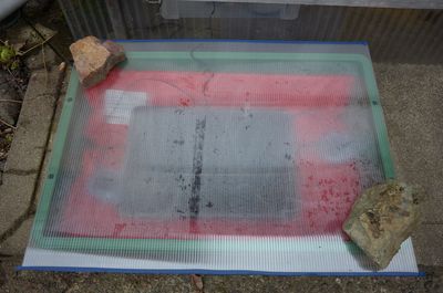 透明なポリカーボネート中空板で蓋をする。空気が抜けて保温性が落ちないように穴の口をビニルテープで塞ぐ。丸いの2つは手製の防水パックに入った温度ロガー。