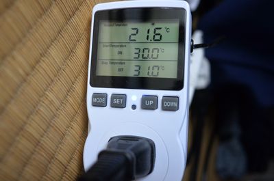 ひなたぼっこ900に付属のサーモスタット。密閉されていて屋外用なのは安心できる。