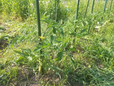 トウモロコシの間に芽生えたトマト。実は小さいが、たぶん大玉。うちの畑で自生苗のトマトは病気で枯れるのが通例だから、今に枯れるだろうと生暖かい目で見ていた。しかし、まだ枯れない。いつまで続くのか。もしかして、これは・・