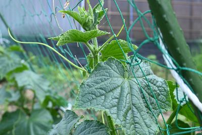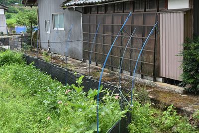 短所、それは凸部。ネットを一直線に張るのなら、問題はない。ネットを下から引っ張れば、グラスファイバーのゆるい弾力で外側に撓み、とても登り難いはずだ。しかし、畑を囲むには必ず角がある。角の部分は内側に倒れやすく、外側に倒すのは難しい。今年は去年より鋭角を避けて、ゆるやかに曲げたつもりだが、それでも難しい。
