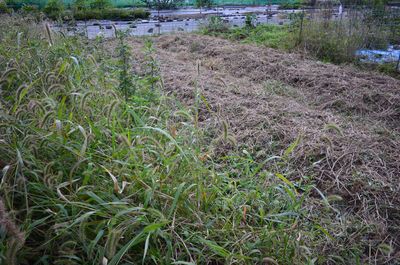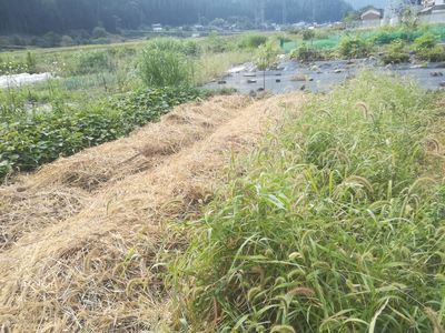 いつもは全部刈ってしまうのだが、今年は1畝残した。どうもこの場所は周囲が耕作放棄地で防草シートばかりなので、雑草が少ない気がするのだ。