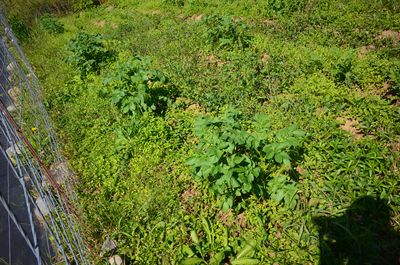 工夫した甲斐があったのか、それとも今年は早くから暑いせいか、いちおう世間並みにナス・ピーマン・ししとうが7月中旬あたりから収穫できている。ただし、ピーマンに病気が多く、3株はダメになりそうだ。同じナス科ながら、乾燥好きらしいピーマンと湿気好きのナスが同じ畝では無理があったか。すでに大玉トマトは沢山食べているのに、いつもながらのミニトマトのソバージュ栽培(放任栽培のことらしい)は、実が沢山あるもののまだあまり赤くならない。カボチャも完熟を待っている。