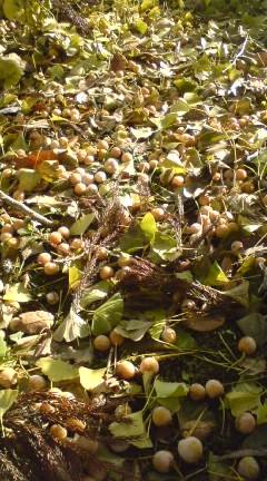 行ってみると、やや小ぶりながら落ちた実で絨毯のようになっていたりして、鷲掴みに掴んだその手がそのまま袋に直行など、贅沢な銀杏拾いでした。帰ってから、網に入れて熟れた実部分をそぎ落とし、湧水に常設してあるたらいに浮かべてゴミを除き、陽が暮れるのでストーブの前で少し干すと、新聞紙2枚になりました。これでとうぶん銀杏には不自由しませんね (^^ヾ